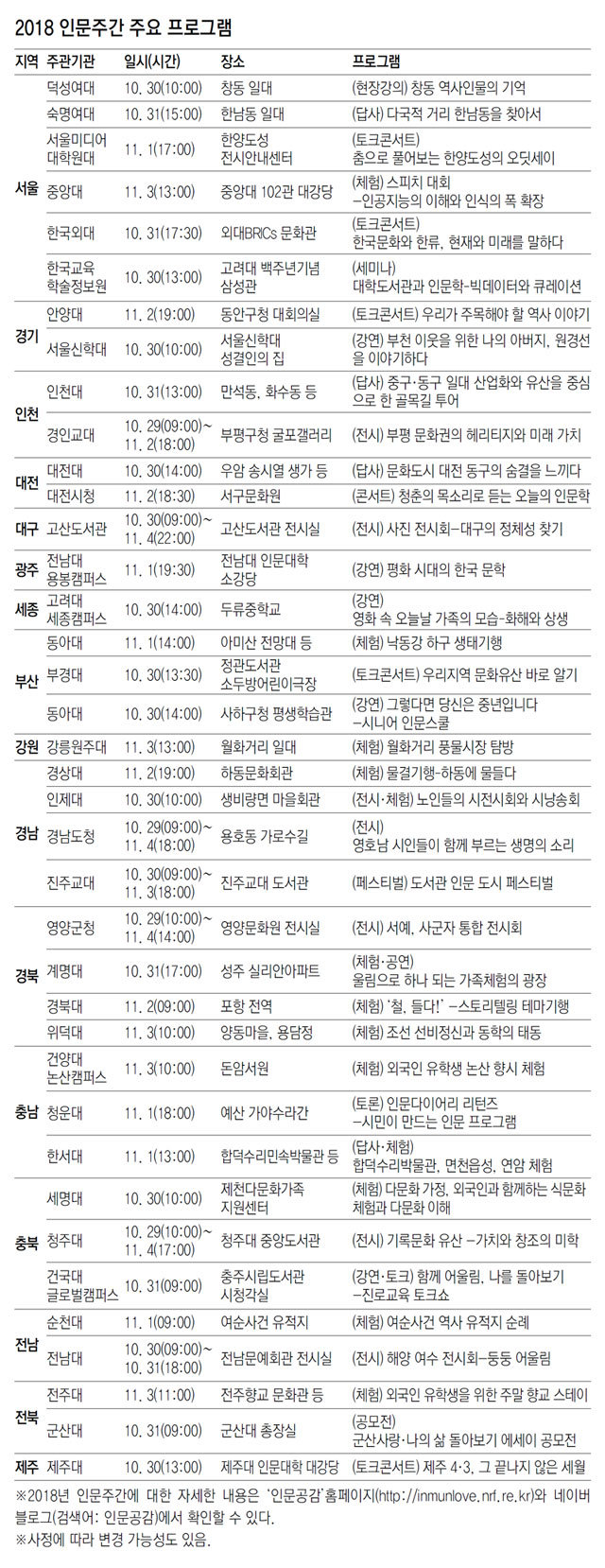 교육부와 한국연구재단은 29일부터 11월 4일까지 2018 인문주간 행사를 개최한다. 올해로 13회째를 맞는 인문주간 행사는 2006년부터 매년 가을 대학과 연구소에서 축적한 인문학 분야의 연구 성과를 일반 시민과 함께 공유하는 행사다.