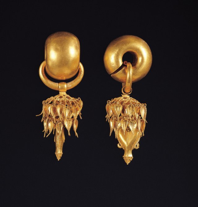 접합 부위가 세밀해 눈으로는 잘 확인되지 않을 만큼 세공 기술이 뛰어나고 작은 구슬 장식도 섬세하고 아름답다. 입체형인 펜촉형 장식물 안팎으로 작은 금 알갱이를 촘촘히 붙여서 표현된 시각적 화려함이 특징이다.