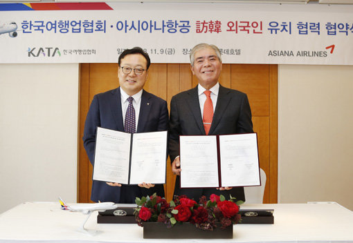 한국여행업협회(회장 양무승, 이하 KATA)와 아시아나항공(사장 한창수)이 외국인 관광객 유치를 위해 손을 잡았다. 양측은 9일 서울 소공동 롯데호텔에서 ‘방한 외국인 유치협력’에 관한 업무협약(MOU)을 체결했다.