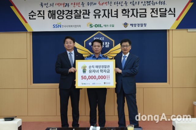 에쓰오일(S-OIL)은 18일 인천 송도 해양경찰청에서 ‘순직 해양경찰 유자녀 장학금 전달식’을 열고 5000만 원을 전달했다. 순직자 유자녀들이 학업을 마칠 때까지 지속적으로 학자금을 지원하기로 약속했다.