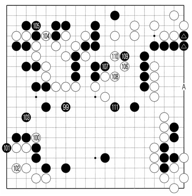 흑 99는 좌중앙을 키우는 수로 큰 곳이다. 백 100으로 끊어 응수타진을 하고는 백 106으로 흑 대마를 공격한다. 흑이 실리를 탐하는 사이에 중앙에서의 공수가 바뀐 상황이다.