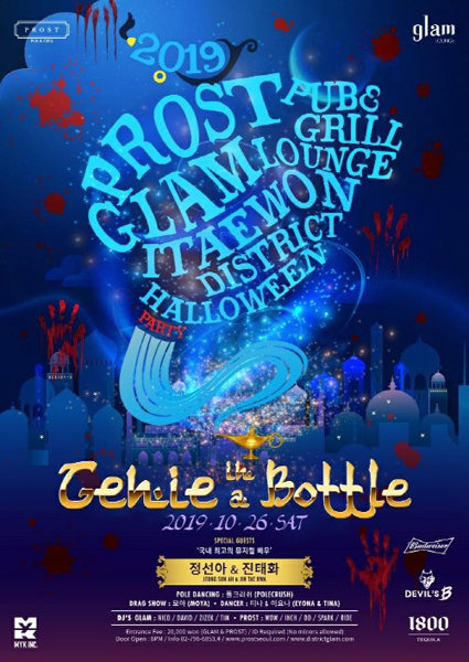 MYK에 따르면 서울 이태원에 자리한 복합 문화 공간 디스트릭트의 1층 프로스트(PROST)와 2층 글램 라운지 (Glam Lounge)에서는 핼러윈 데이(10월 31일)를 앞두고 영화 ‘알라딘’을 콘셉트로 2019 핼러윈 파티 ‘지니 인 어 보틀(Genie in a Bottle)’을 진행한다.