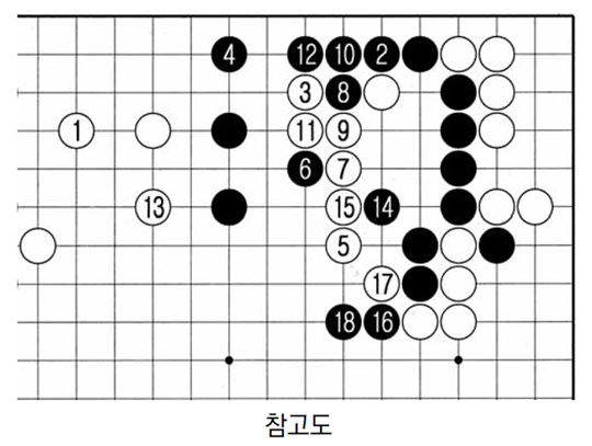 상변 전투에서 침착한 수읽기로 상대의 백말을 양곤마로 몰아붙인 것이 결정적이었다. 참고도를 보자. 백 1(실전 40)로 자리 잡아 백돌이 무난하게 타개되나 싶었다. 상변 흑 진이 이렇게 무너지면 실리를 많이 벌어 놓은 백이 유리해진다. 이때부터 흑의 인내의 행군이 시작된다. 특히 흑 8, 10으로 2선으로 넘어간 것이 굴욕처럼 보이지만 먼 미래를 내다본 일보 후퇴였다. 이렇게 근거를 빼앗아 놓고 마음껏 공격하겠다는 것. 결국 흑 16, 18로 공격하게 돼선 흑이 주도권을 잡았다.