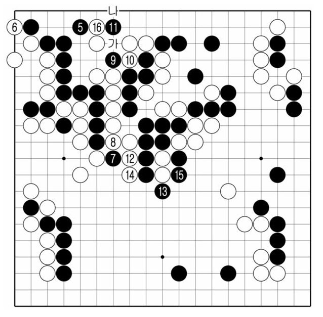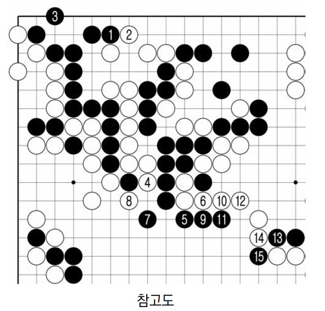 흑 9로는 참고도 흑 1, 3으로 패의 모양을 만드는 것이 끈질기게 버티는 수였다. 참고도 흑 15까지 이어지면 국면이 복잡해져 흑도 기회를 잡아볼 수 있다. 좌상 귀는 흑백 누가 먼저 둬도 패가 나는 형태다. 백 16이 놓이자 좌상 흑이 결국 잡혔다. 흑 ‘가’로 이으면 백 ‘나’가 있다.