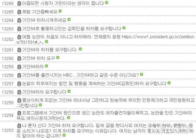 MBC 예능프로그램 ‘나혼자 산다’ 시청자 게시판에는 13일 오후 3시 기준 약 2200개의 항의글이 게시된 상태다. 대부분 웹툰작가 기안84의 하차를 요구하는 내용이다. “하차까지는 과한 반응이다”라는 의견도 있지만 극소수다.