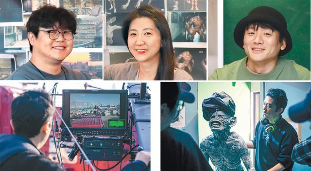 영화 ‘스위트홈’의 시각특수효과를 담당한 이병주 웨스트월드 슈퍼바이저와 정고은 이사, 크리처들의 움직임을 설계한 김설진 안무가(위 왼쪽 사진부터). 이 영화에는 촬영현장에서 실시간으로 컴퓨터그래픽(CG)이 적용된 화면을 볼 수 있는 ‘버추얼 프로덕션’이 국내에서 처음 도입됐다. 스태프가 보는 카메라 화면에 ‘근육괴물’ CG가 덧입혀져 돌진하는 소방차와 맞서는 장면이 뜬다(아래 왼쪽 사진). 연근괴물로 특수 분장한 김 안무가 옆에서 이응복 PD가 움직임을 지도하고 있다. 넷플릭스 제공