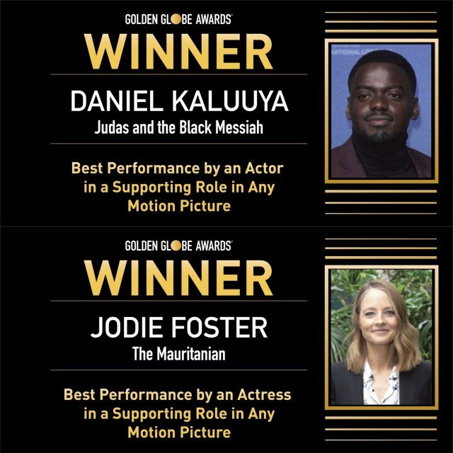 ‘주다스 앤 더 블랙 메시아’ 다니엘 칼루야와 ‘모리타니안’ 조디 포스터가 골든글로브 영화 부문 남녀조연상을 수상했다.