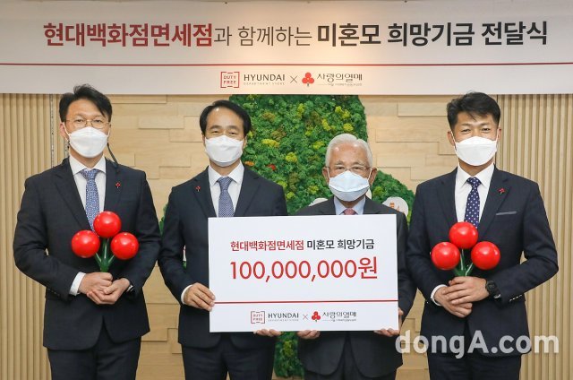 현대백화점면세점은 29일 저소득층 미혼모들의 자립을 지원하기 위해 1억 원을 사회복지공동모금회에 전달했다고 밝혔다. 지원금은 ‘고마워요, 엄마 캠페인’ 사업에 사용될 예정이다. 이날 서울시 중구 소재 사회복지공동모금회에서 열린 전달식에는 이재실 현대백화점면세점 대표와 윤영석 서울 사회복지공동모금회 회장 등 주요 관계자들이 참석했다.