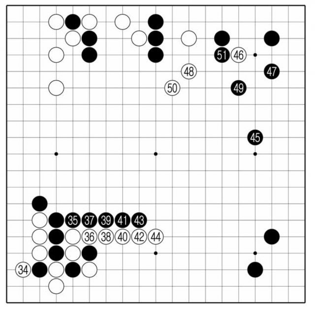 백 34는 약간 아쉬움이 남는다. 참고도처럼 1로 따내는 게 깔끔했다. 그럼 흑 8까지가 예상되는데 백 9, 11로 축머리를 활용하는 바둑이 된다. 백이 나쁘지 않은 결과다. 실전은 흑 35 이하 43까지 중앙을 밀어가는 수순이 비록 6선이기는 하나 두텁다. 중앙이 두텁게 변하며 상변의 엷음도 조금은 부담을 덜었다.