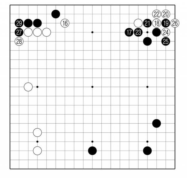 백 16이 성급했다. 참고도처럼 백 1로 둬서 흑 2로 받게 한 다음 3으로 두는 것이 올바른 수순이었다. 커 9단이 이런 실수를 하다니 믿기지 않는다. 실전은 흑 17로 눌림 당해 백 16의 가치가 작아졌다. 백 18, 20도 서둘러 안정하겠다는 뜻이지만 최선의 선택인지는 의문이다. 흑 21, 23이 정확한 응수로 백 26까지 진행된 결과는 흑 만족이다. 흑 27, 29는 끝내기처럼 보이지만 요처다.