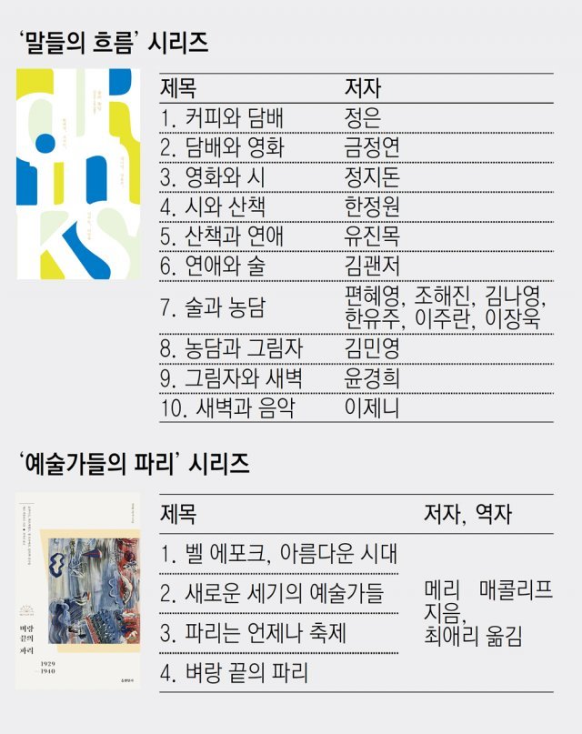 최근 독자와 출판계 관계자들의 눈길을 끌고 있는 시리즈가 있다. ‘말들의 흐름’ 시리즈다. 출간된 책 전부가 3쇄 이상을 찍을 정도로 꾸준히 인기를 끌고 있다. ‘술과 농담’은 7번째 책이다. 두 소설가 외에 시인과 소설가 4명이 각자 술과 농담에 대한 생각을 여러 편의 산문으로 풀어놨다. 저자 한 명이 쓴 이전 시리즈와 달리 유명 작가들이 여럿 참여하며 더 큰 관심을 받았다. 1일 출간된 이 책은 인터넷서점 알라딘 에세이 분야 판매 17위를 차지하고 있다.
