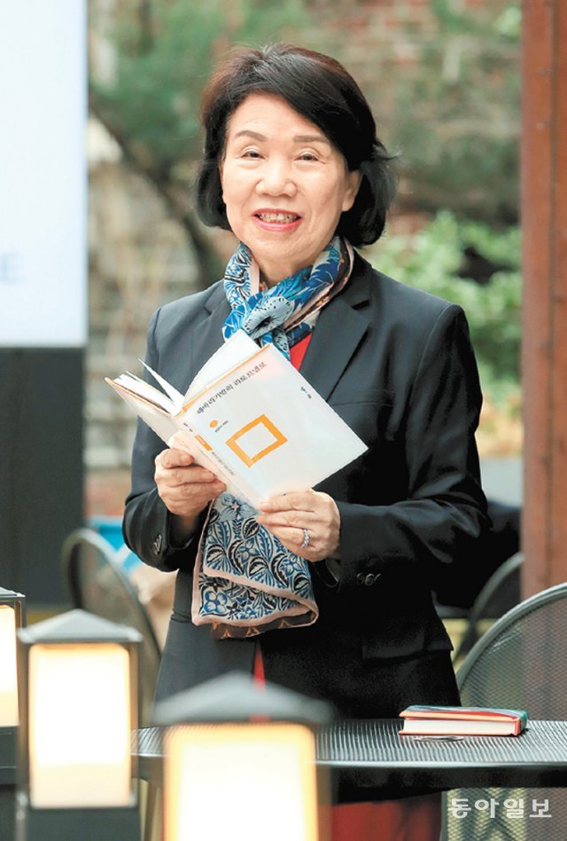 최문자 시인이 21일 시집 ‘해바라기밭의 리토르넬로’를 들고 있다. 그는 “단어가 떠오르지 않아 미쳐버릴 것 같을 때 집 뒤 칠보산으로 간다. 매일 한 시간 이상 풀과 꽃 범벅인 길을 걷는다. 치매가 오면 맨 먼저 산책하다 길을 잃을 것 같다”며 웃었다. 장승윤 기자 tomato99@donga.com