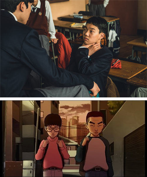 티빙 오리지널 드라마 ‘돼지의 왕’에서 중학생 경민(이찬유)이 가해자에게 “자살 놀이를 해보라”는 협박을 받고 자신의 목을 조르고 있다(위쪽 사진). 원작은 2011년 개봉한 연상호 감독의 동명 애니메이션이다. 아래쪽 사진은 애니메이션에서 학교 폭력 피해자인 경민(왼쪽)과 종석이 힘없이 걷고 있는 모습. 티빙·스튜디오 다다쇼 제공
