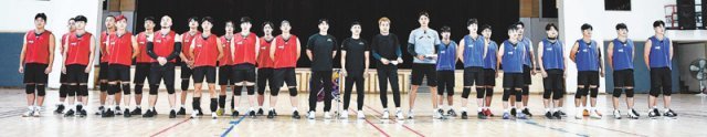 강원 속초시실내체육관에서 지난달 23일 진행된 채널A ‘강철볼-피구전쟁’ 촬영에서 출연진이 선전을 다짐하고 있다. 황충원 씨는