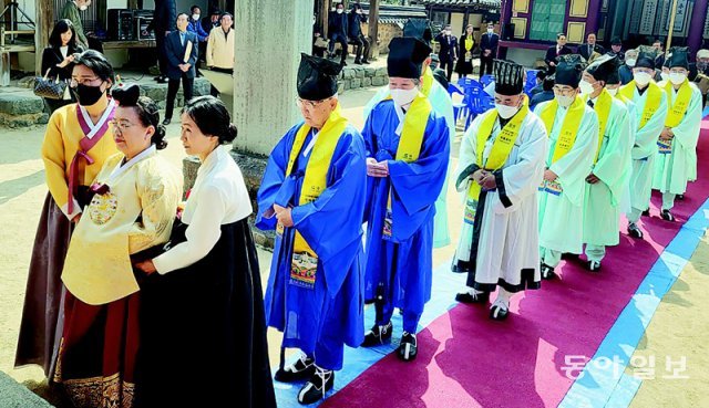 하서 김인후 선생의 학덕을 기리는 춘향제가 10일 전남 장성군 황룡면 필암서원에서 열렸다. 맨 앞 가운데에 서 있는 여성이 춘향제 초헌관을 맡은 이배용 국가교육위원회 위원장이다. 장성=정승호 기자 shjung@donga.com