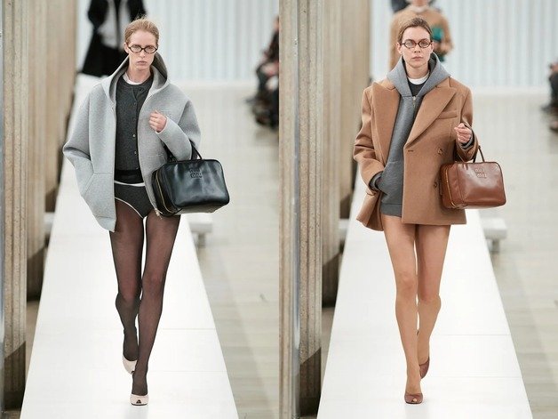 먼저 프라다는 허벅지를 반쯤 덮는 코트에 스타킹만 신는 ‘하의 실종’ 패션을 보여줬다. 프라다 그룹 산하 브랜드 미우미우 역시 넉넉한 길이의 상의만 입어 하체를 가리거나 여성용 삼각팬티를 연상하는 하의를 매치하기도 했다.