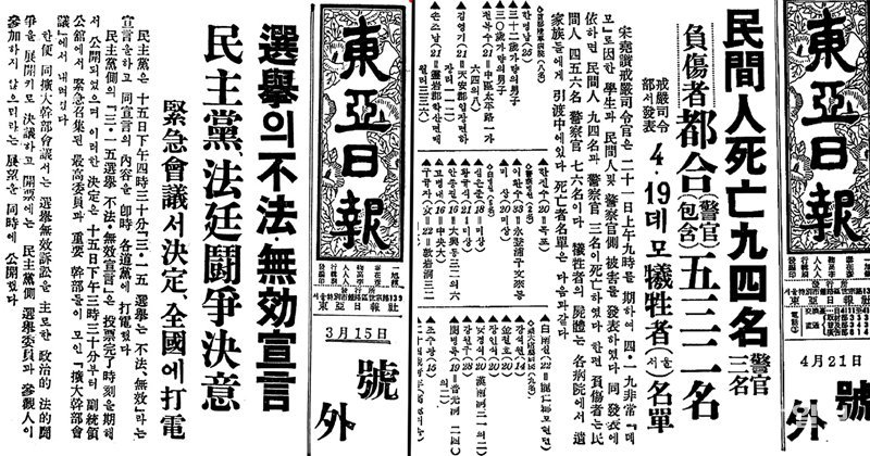 유네스코 세계기록유산으로 등재될 예정인 1960년 4·19혁명 기록물 중 동아일보 호외들. 4·19혁명의 도화선이 된 3·15 부정선거 당일, 야당의 선거 무효 선언 등 반발 움직임을 전한 호외(왼쪽 사진)와 4·19 시위 이틀 뒤 총격 등으로 인한 사망자 명단을 실은 호외. 동아일보DB