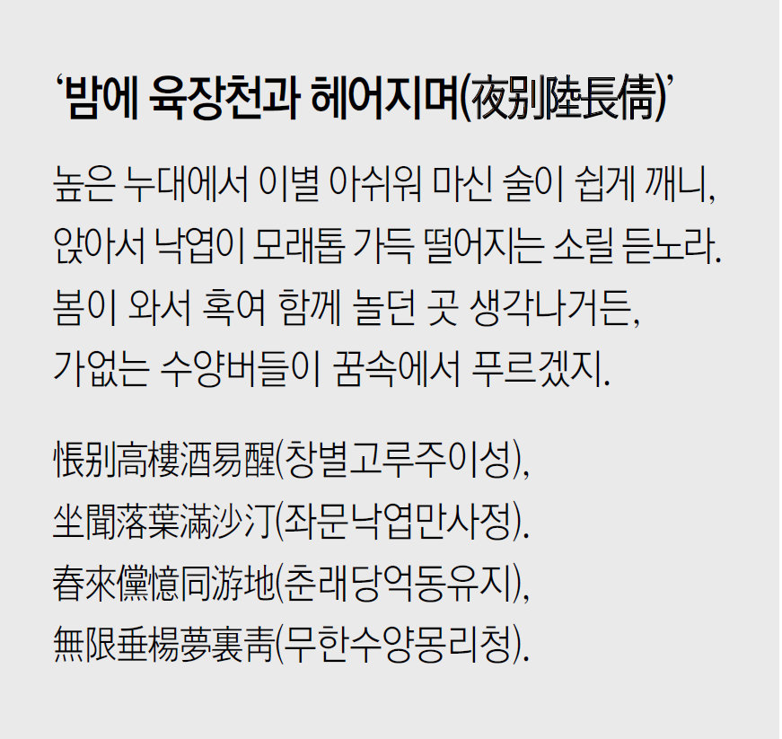 시인은 이별이 못내 아쉬워 잠 못 이뤘던 듯하다. 모래톱 위로 낙엽 지는 소리가 유독 청각을 자극한 이유는 술이 깬 탓도 있지만 떠난 이에 대한 그리움이 간절해서일 것이다. 시인은 그리움을 함께 놀던 장소와 푸른 수양버들의 기억으로 연결시켰다. 시인은 자신에겐 보이지 않는 공간과 색깔로 그리움을 윤색하였다.
