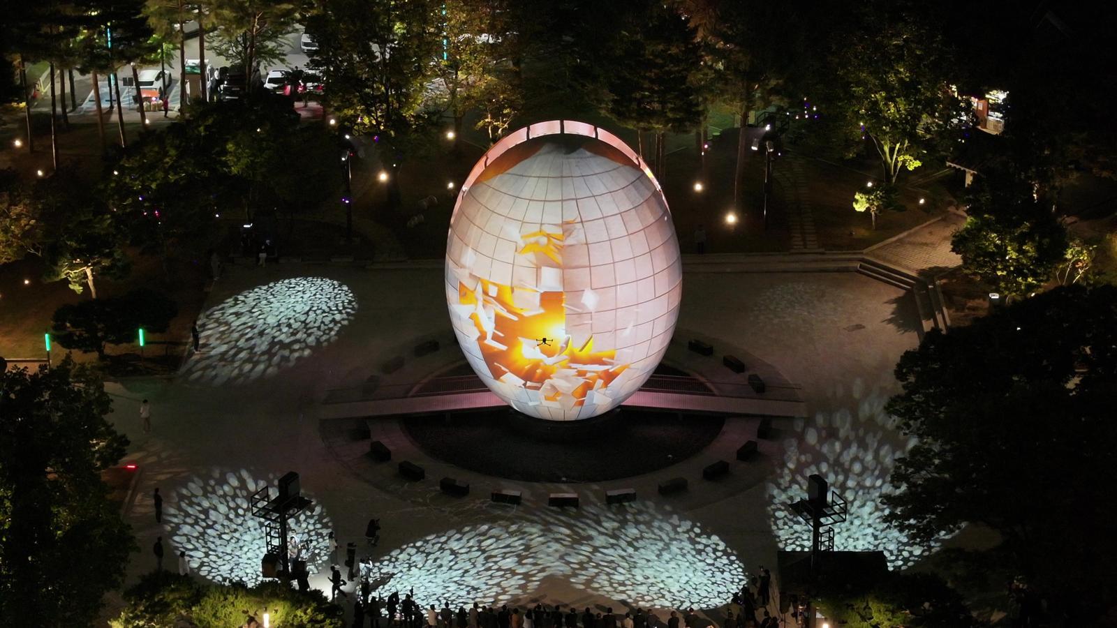 오후 7시 반, 어둠이 내려앉은 보문단지에 빛이 일렁였다. 1979년 우리나라 최초의 컨벤션센터로 지어진 ‘육부촌’(六部村·‘신라를 이룬 여섯 부족’이라는 뜻으로, 현재 경상북도문화관광공사 건물)이 미디어아트로 장식된 것. 호반광장에는 신라 시조 박혁거세의 탄생 알을 형상화한 15m 높이의 APEC 상징조형물도 등장했다. 미디어아트가 알 위를 꽃으로 수놓는 모습이 보문단지의 부활을 알리는 것 같아 뭉클했다.
