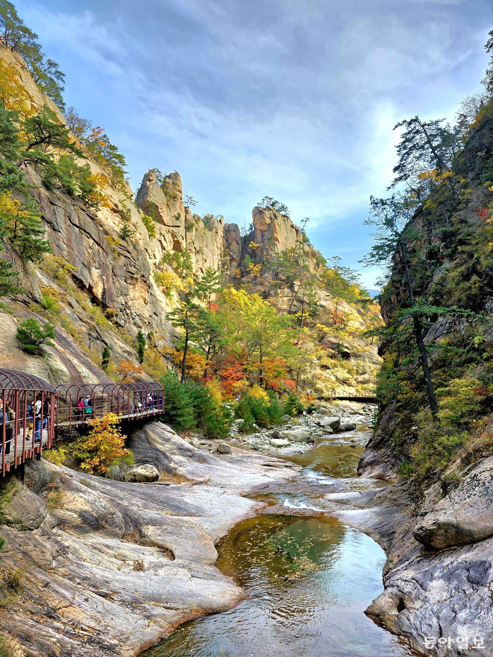 흘림골 탐방로 곳곳에는 터널처럼 둥근 철망 구조물이 있다. 2015년 낙석사고 이후 7년간 통제되면서 시설을 보수한 흔적이다. 철제 터널을 지나며 내려가다보니 등선(登仙)폭포가 나타난다. 신선이 등선대에서 하늘로 오르기 전에 몸을 정갈하게 씻었던 폭포라고. 수량이 많을 때면 물줄기가 신선이 하늘로 오를 때 백발이 휘날리는 것처럼 보인다고하는데 가을이라 수량은 많지 않다. 그러나 하늘에서부터 30m의 낙차를 보이며 이리 꺾이고, 저리 꺾이며 내려오는 폭포는 설악의 신비스런 정취를 보여주기엔 충분했다.