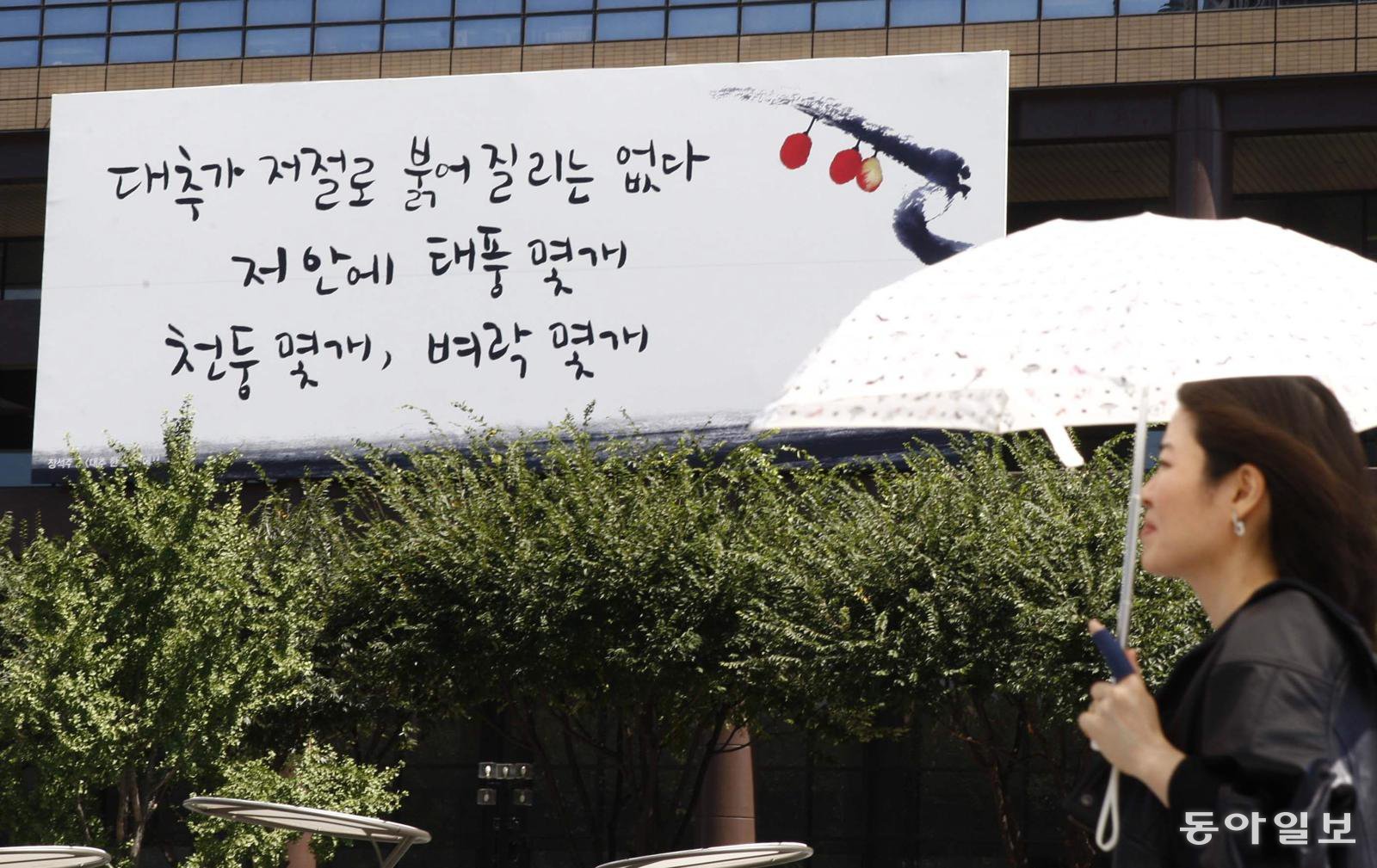 2009년 8월 31일 서울 광화문 교보생명빌딩 ‘광화문 글판’에 고진감래(苦盡甘來)의 의미를 담은 장석주 시인의 ‘대추 한 알‘ 문구가 걸려 눈길을 끌고 있다. 홍진환 기자 jean@donga.com