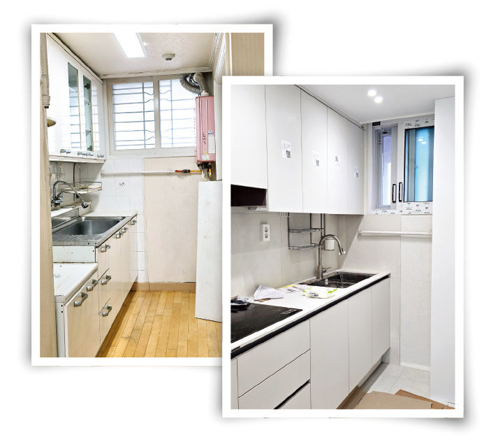 서울 서대문구에 있는 27년 차 아파트 주방을 ‘반셀프 인테리어’로 바꾸기 전(왼쪽)과 후 모습. 독자 제공