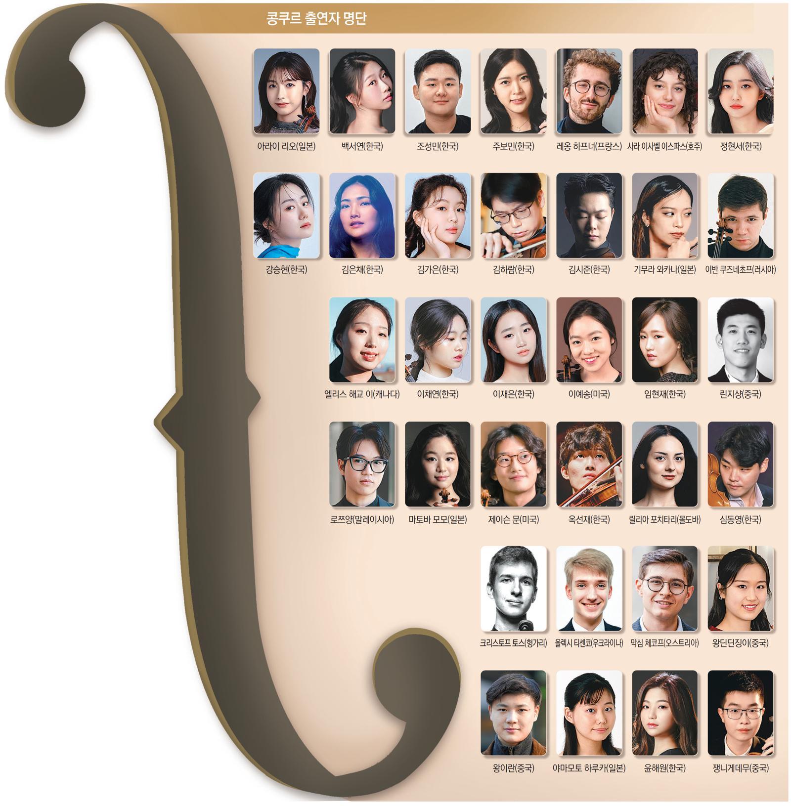 한국인으로는 2022 시벨리우스 콩쿠르에서 최연소 입상한 이예송, 2018 메뉴인 콩쿠르 3위 임현재, 2024 윤이상 콩쿠르 3위와 2022 크라이슬러 및 2020 바흐 콩쿠르 입상 경력을 가진 심동영이 눈에 띈다. 외국인 참가자로는 2018 크라이슬러 콩쿠르 2위를 수상한 캐나다 엘리스 해교 이, 2019 쇤탈 콩쿠르 특별상을 받은 오스트리아의 막심 체코프가 도전한다.