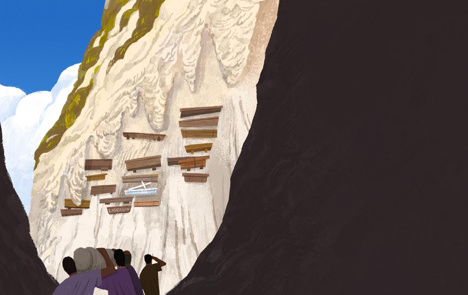 멕시코의 ‘죽은 자의 날’ 축제부터 한국의 차례상 문화까지, 세계 각국은 저마다의 장례 풍습을 통해 죽은 이를 산 자의 기억 속에 기려 왔다. 사진은 필리핀의 ‘절벽에 매달려 있는 관’을 나타낸 일러스트. 시그마북스 제공