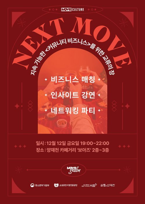 문화기획사 무브컬쳐가 오는 12일 서울시 서초구 양재천 카페거리에서 지속 가능한 ‘커뮤니티 비즈니스’를 위한 교류의 장 ‘넥스트 무브(NEXT MOVE)’를 개최한다고 밝혔다.