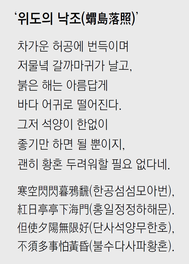 시인이 윤경망(尹景望)을 위해 해장(海莊) 주변의 여덟 곳의 명승을 읊은 ‘해장팔영(海莊八詠)’ 중 한 수다. 한시에선 뛰어난 경치를 여덟 가지로 읊곤 했는데 이 작품도 그런 전통을 잇고 있다. 시에서 포착한 아름다운 정경은 최립이 말한 것처럼 저물녘 낙조다. 하지만 시인은 이상은의 시구를 떠올리면서도 그 의미를 뒤집어 황혼이 오는 것을 걱정하지 말고 석양의 아름다움을 즐기라고 썼다.