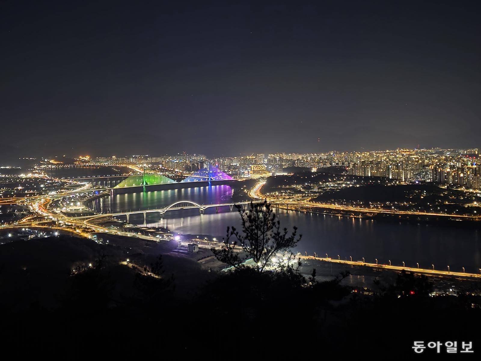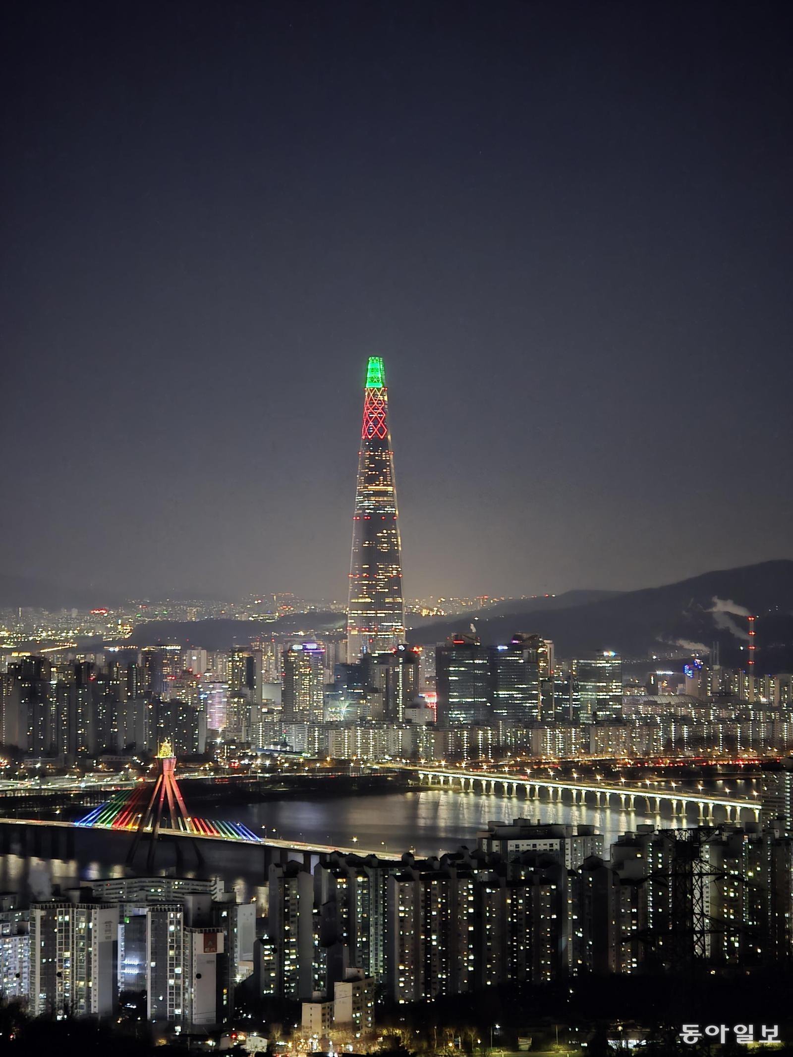 아차산 고구려정에서 바라본 잠실 야경. 가로등은 오렌지빛을 뿜어내고, 동부간선도로에 늘어선 자동차의 후미등이 빨갛게 빛난다. 곳곳에 점멸하는 전광판의 광고도 선명하다. 미국 LA그리피스 천문대에서 바라봤던 로스앤젤레스의 별빛 야경보다 더 드라마틱한 서울의 밤풍경이다.