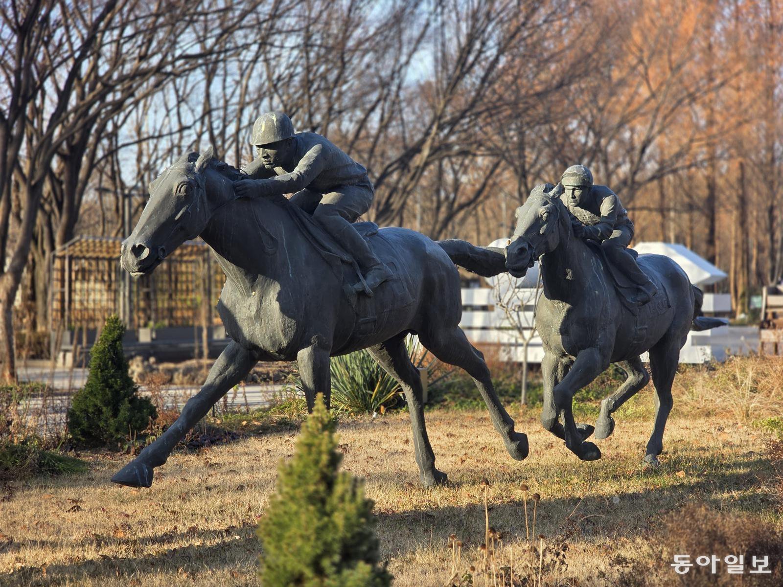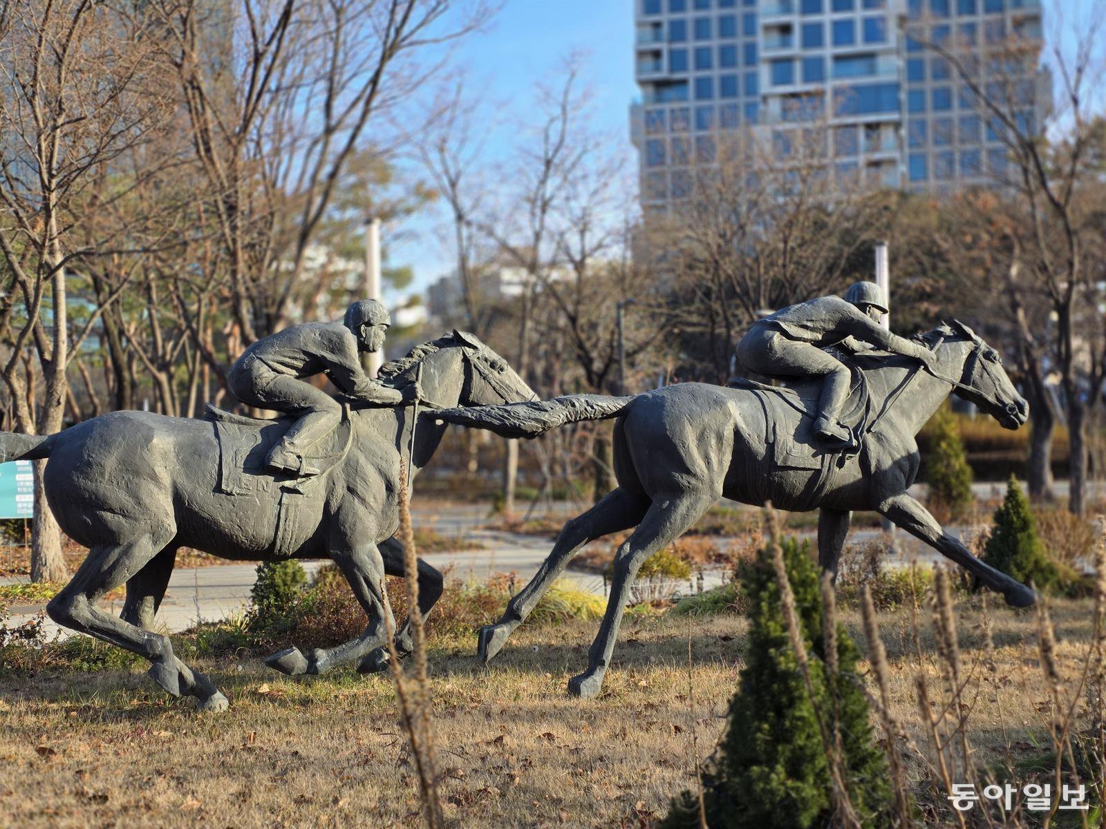뚝섬경마장이 있던 역사를 추억하는 서울숲 군마상. 이번엔 발길을 서울숲으로 옮겨본다. 기수들이 말을 타고 질주하는 군마상이 관람객을 맞이한다. 살아 있는 말이 뛰는 듯 생생한 조각상이다. 뚝섬에서 말이 달렸던 것은 조선시대 뿐 아니다. 1954년부터 1989년까지 뚝섬에 경마장이 있었다.