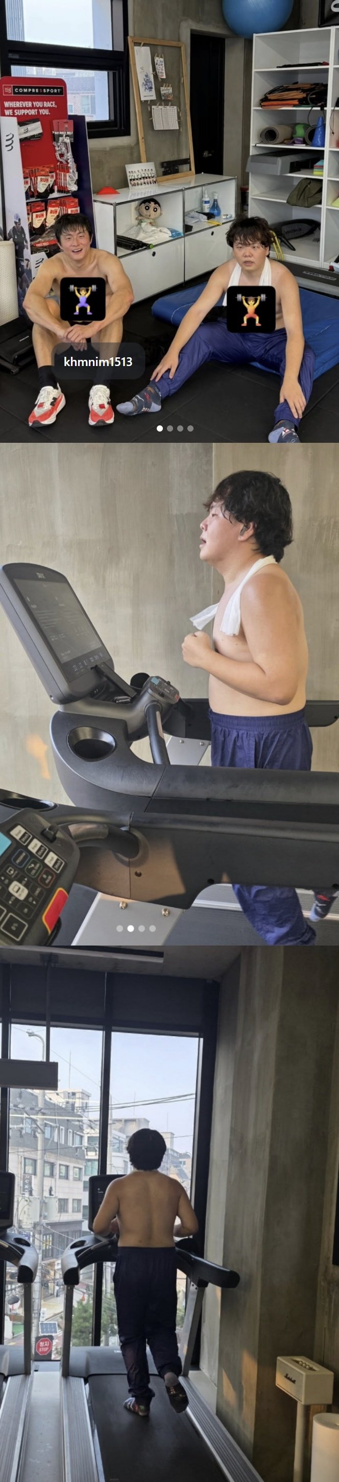 공개된 사진 속 곽튜브는 웹툰작가 겸 방송인 기안84와 체육관 바닥에 앉아서 쉬고 있다.