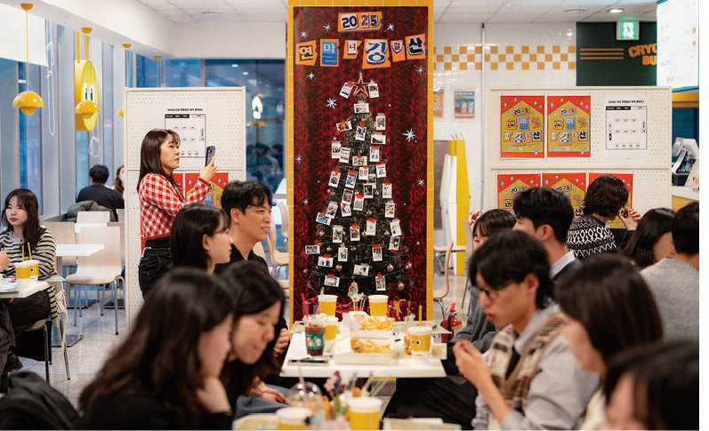 참가자들이 신문 1면을 본뜬 활동지 헤드라인 칸에 새해 목표를 적고 있다.연말, 버거집, 낯선 사람. 평소라면 함께 등장하지 않을 세 단어가 이날만큼은 자연스러운 조합이었다. 신효정 씨(27)는 “관심사와 고민이 비슷한 사람들이 모이다 보니 짧은 시간이었는데도 금세 가까워졌다”고 말했다. 행사가 끝나자 참가자들은 매장 곳곳에서 사진을 찍으며 다음 만남을 기약했다. 이날 모임은 연말을 취향 기반의 관계 맺기 기회로 확장하려는 2030세대의 풍경을 보여줬다.
