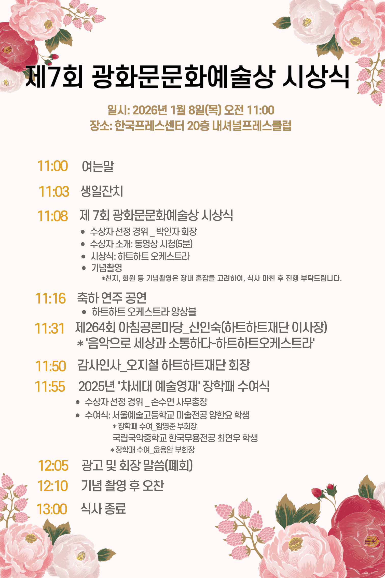 6일 광화문문화포럼(회장 박인자)은 제7회 광화문 문화예술상 수상자로 하트하트오케스트라를 선정했다고 밝혔다. 시상식은 오는 8일 오전 11시, 한국프레스센터 20층 내셔널프레스클럽에서 열린다.
