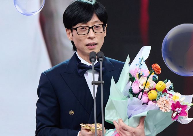 지난해 12월 29일 서울 상암동 MBC 미디어센터 공개홀에서 진행된 ‘2025 MBC 방송연예대상’ 시상식에서 대상을 받은 방송인 유재석에게 레고 꽃다발이 전달됐다. MBC 인스타그램 캡처