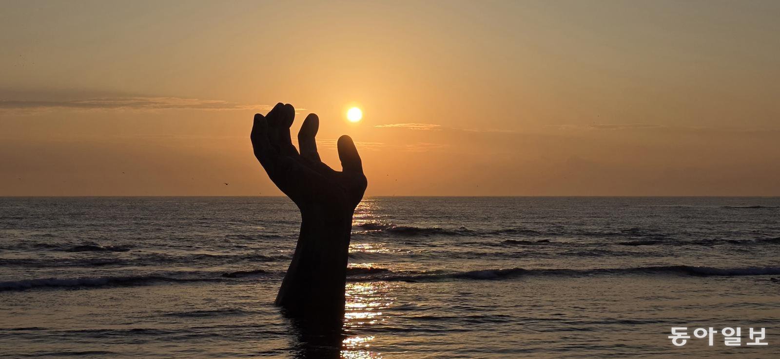 일출 직전 상생의 손 위에 갈매기들이 날아 앉았다. 포항=김선미 기자 kimsunmi@donga.com 붉은 해가 수평선 위로 아기 얼굴처럼 떠오르기 시작했다. 누군가는 두 손을 모아 기도했고 누군가는 상생의 손이 해를 구슬처럼 잡은 것처럼 구도를 잡아 사진을 찍었다. 동행자가 말했다. “두 팔 벌려 새해의 기운을 받아 봅시다.” 두 눈을 감고 두 팔을 벌리니 정말로 해의 우렁찬 기운이 온몸을 적시는 기분이었다.