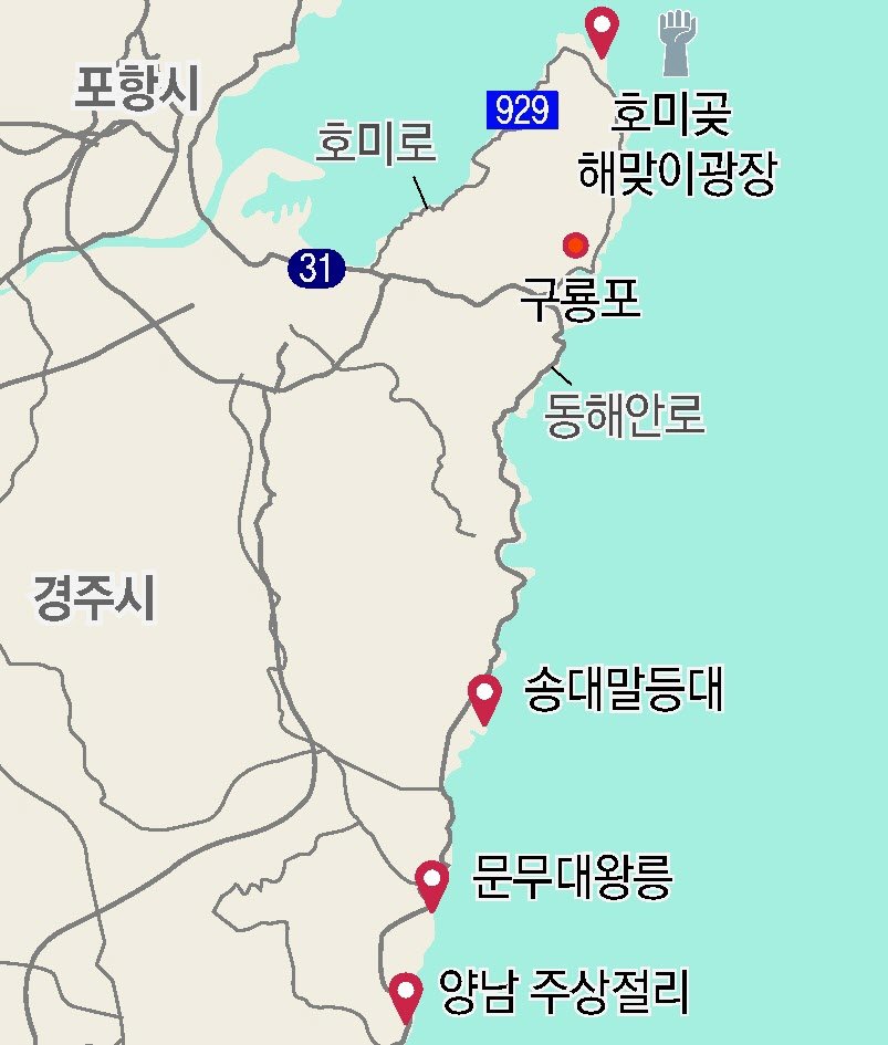 경주역으로 가는 길에는 호미반도 해안둘레길 1코스를 둘러봤다. 해병대 상륙 훈련장으로 사용되는 백사장을 걷다가 시인 이육사 조형물을 만났다. 시인은 휴양차 포항에 머물던 1936년 청림동 청포도 농장을 바라보며 ‘청포도’ 시를 구상했다고 한다. 인근 ‘촌놈물회’의 시원한 물회 한 그릇이 여행을 청량하게 마무리해 줬다.