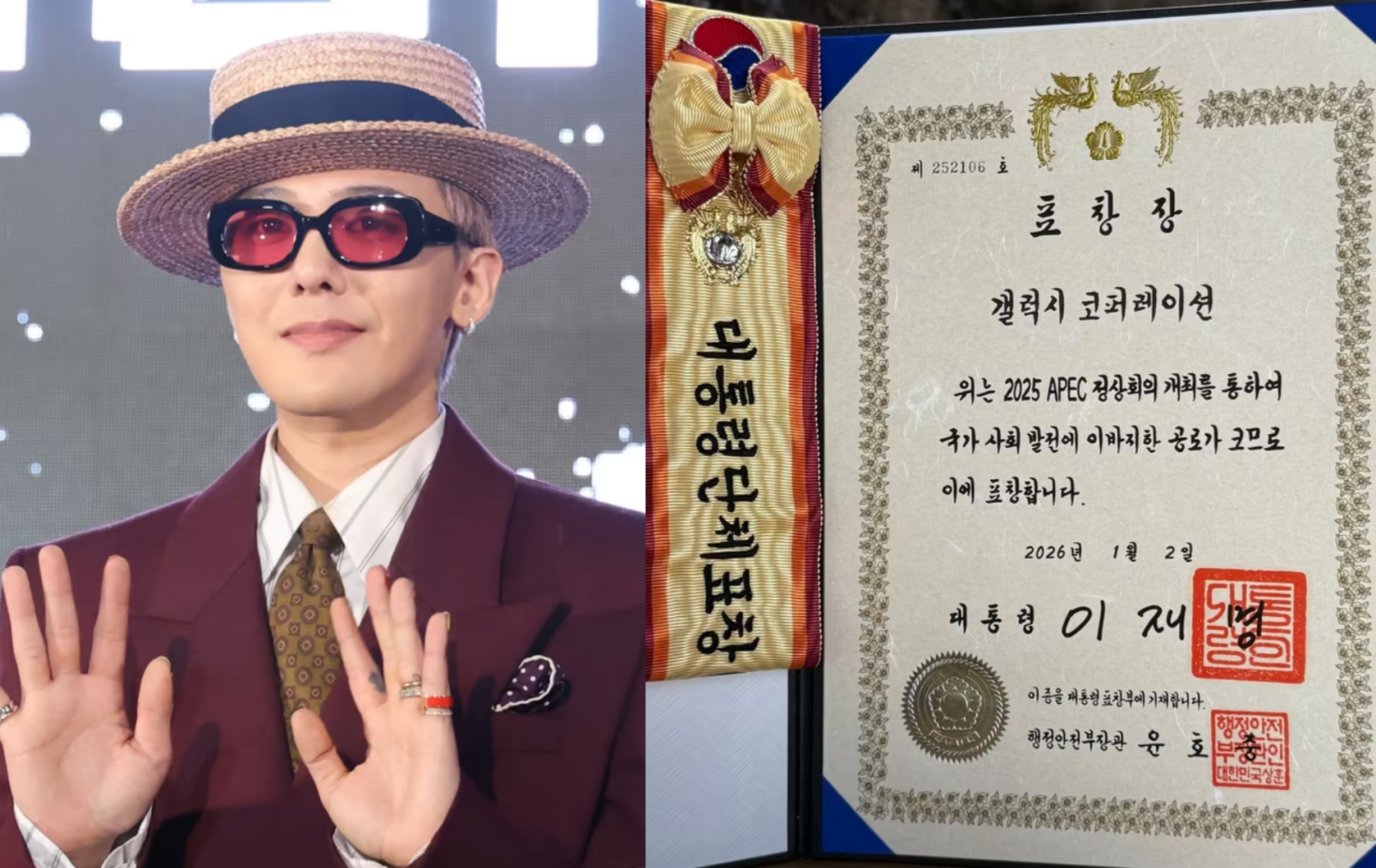 가수 지드래곤의 소속사 갤럭시코퍼레이션이 2025 APEC 정상회의를 빛낸 공로를 인정받아 대통령표창을 받았다.