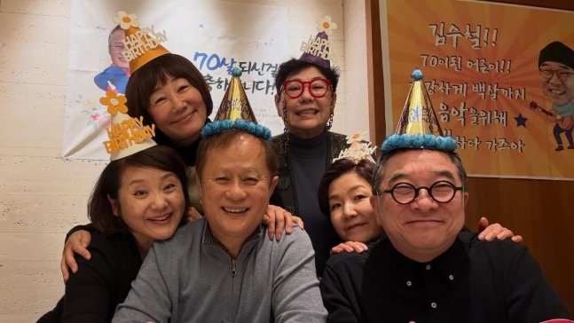사진에는 송승환과 김수철이 생일 모자를 쓴 채 식탁 앞에 앉아 미소 짓는 모습이 담겼다.