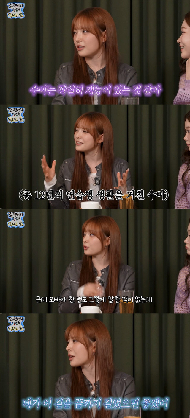 문수아는 “나한테는 말을 안 했지만 주변 사람들에겐 많이 얘기했다더라. ‘수아는 확실히 나보다 재능이 있는 거 같아’라고 했다는 걸 들었다”고 답했다.