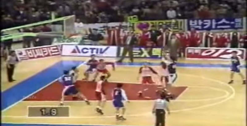 한국 농구 역대급 4초의 승부. 연세대 서장훈이 고려대와의 라이벌 전 4초를 남겨놓고 75-75에서 극적인 버저비터로 승리의 마침표를 찍는 장면. KBS 유튜브 캡쳐.