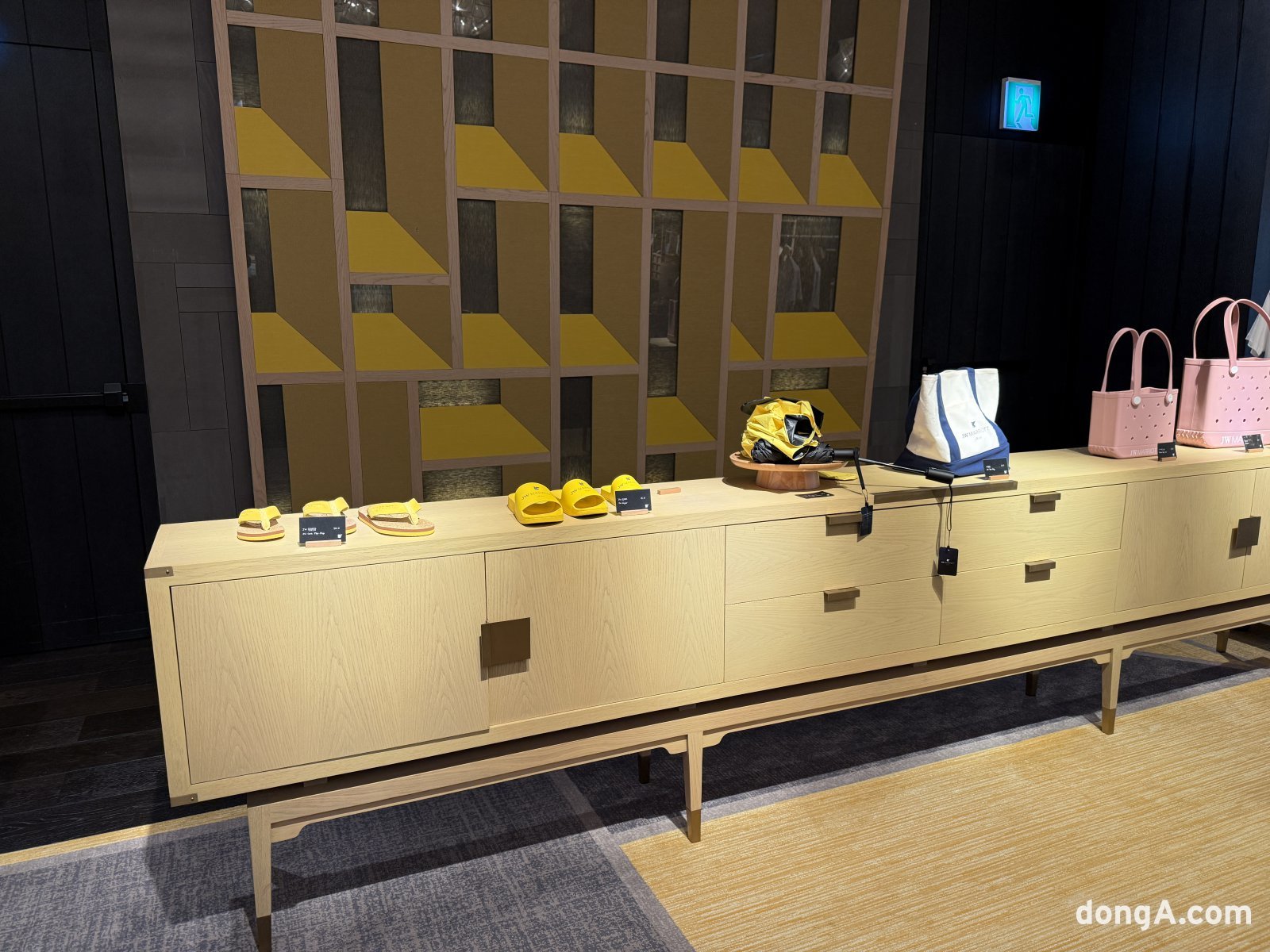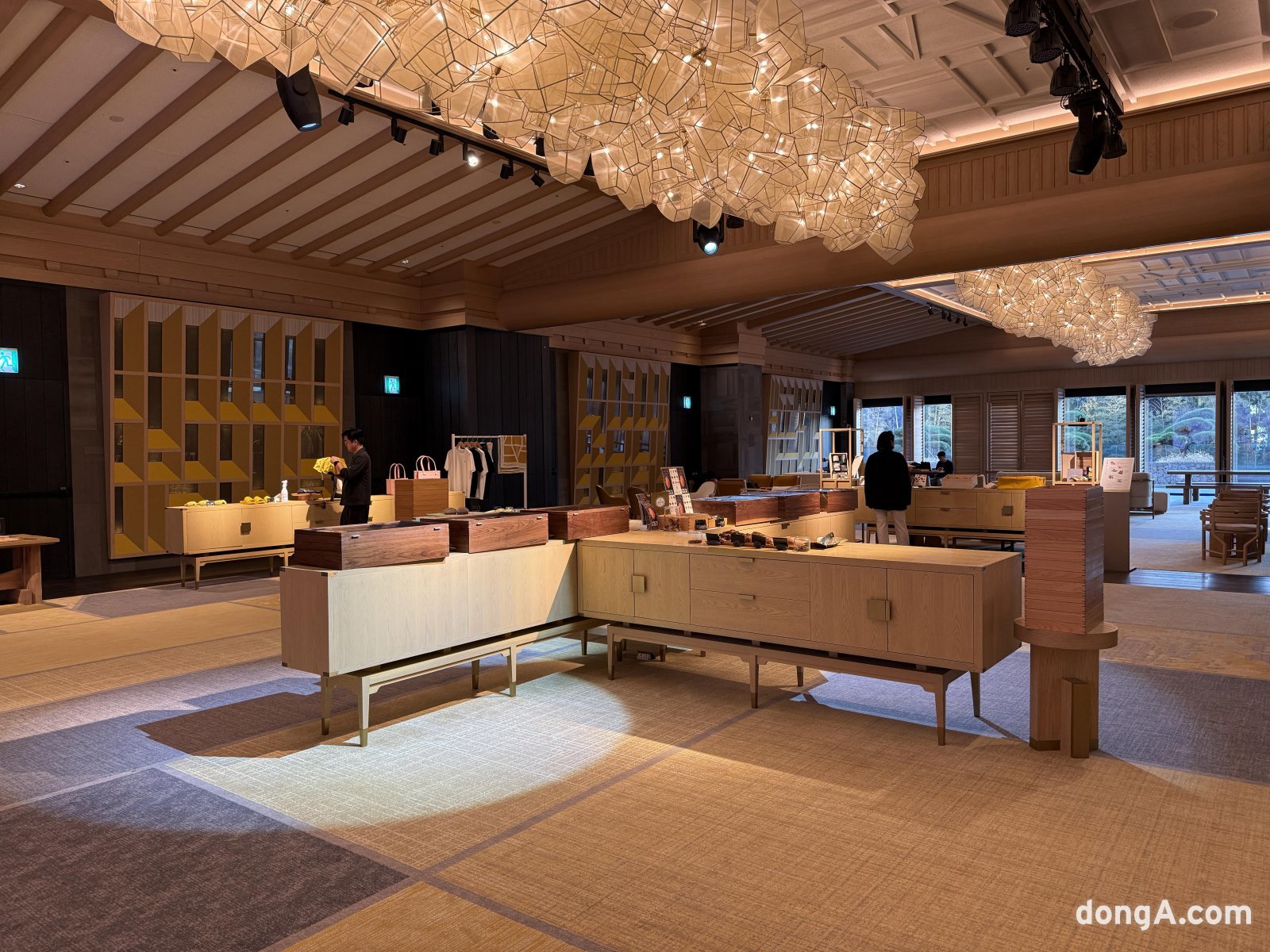 호텔에 들어서면 빌 벤슬리의 설계 철학이 눈에 띈다. 제주 유채꽃밭의 노란색을 메인색상으로 사용했으며, 현무암의 패턴을 인테리어에 반영했다. 천장과 거울, 목재 틀에는 유채밭의 구획을 연상시키는 패턴이 섬세하게 적용되어 있었다.