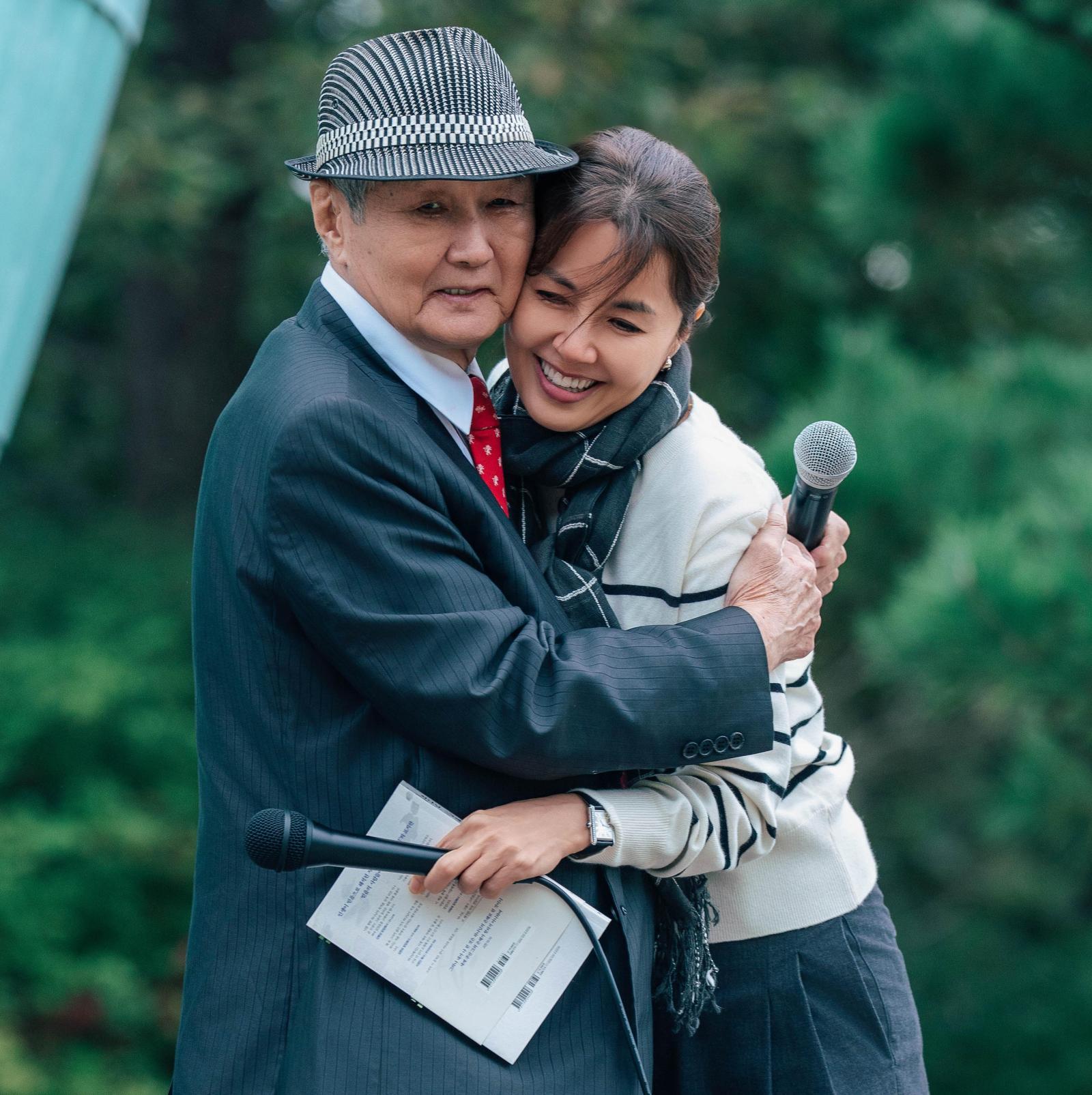 배우 신애라 씨(오른쪽)가 아버지 신영교 씨에게 못다 한 말을 전한 뒤 포옹하고 있다. 하이패밀리 제공