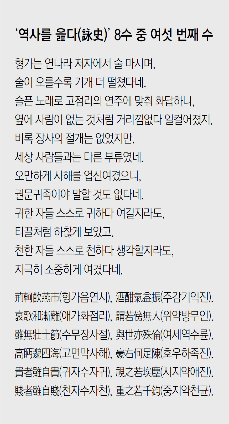 형가는 연나라 태자의 부탁을 받고 진시황을 암살하려다 실패한 자객이다(본 칼럼 37회 참조). 시 제목만 보면 역사 기록에 근거해 형가의 행적을 재현한 것처럼 보이지만, 시 속의 형가는 역사 속 인물이라기보다 시인의 생각과 가치 판단이 깊이 개입된 존재다. 청나라 학자 하작(何焯)은 이 연작시를 두고 이전의 영사시(詠史詩·역사적 사실이나 인물을 제재로 한 시)와 달리 시인의 마음속 생각을 읊은 변화된 형식의 작품이라고 평가했다(‘義門讀書記’).