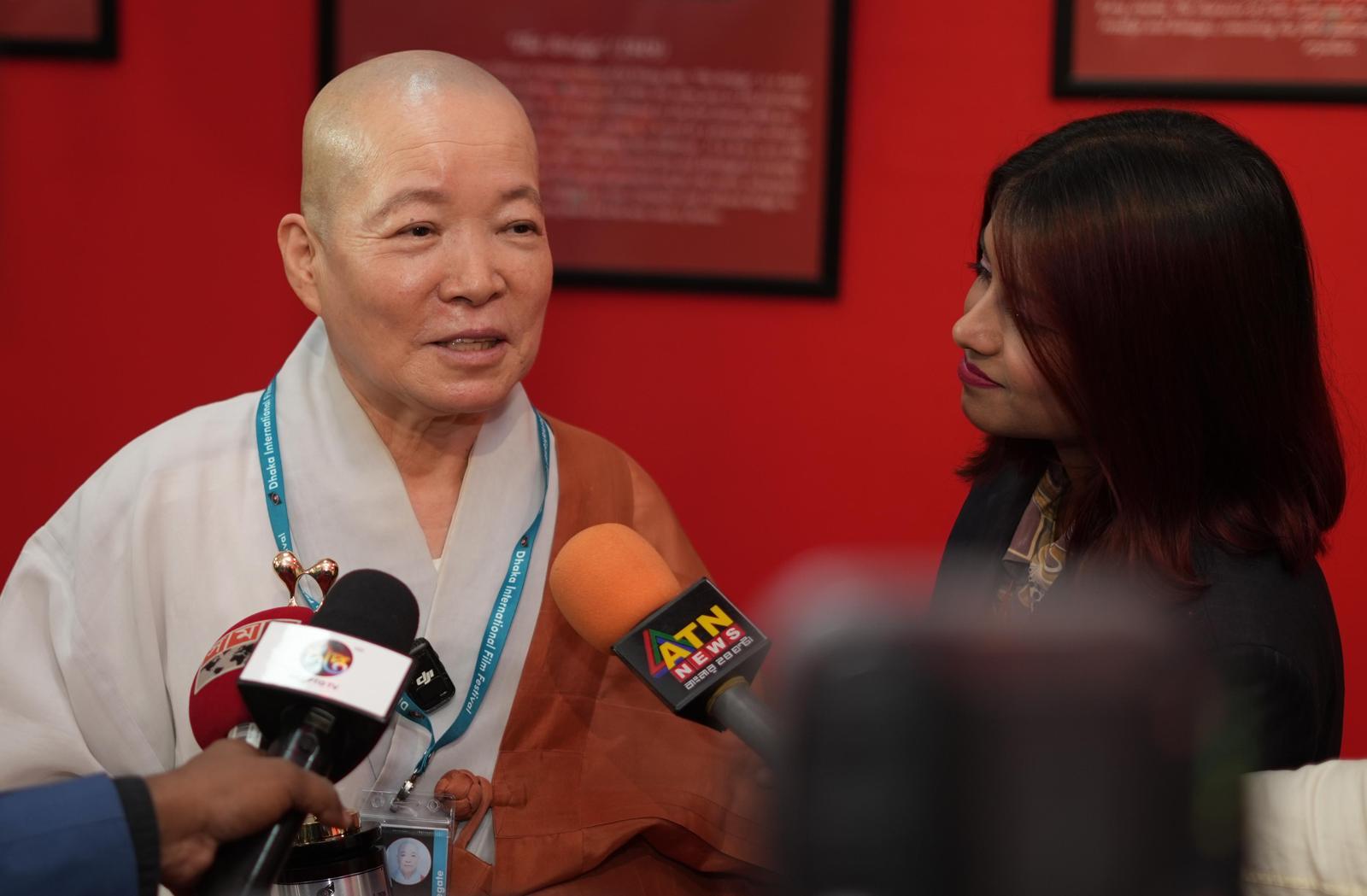 다카 국제영화제 영적 영화 부문 최우수작품상을 받은 대해 스님이 취재진의 질문에 답하고 있다. 그는 “영화는 한번 만들면, 시간과 공간을 넘어 언제든지 많은 사람에게 부처님의 말씀을 전할 수 있는 좋은 도구”라며 “부처님도 지금 세상에 나셨으면 영화나 K팝 등으로 설법하셨을지 모른다”고 웃으며 말했다. 대해 스님 제공