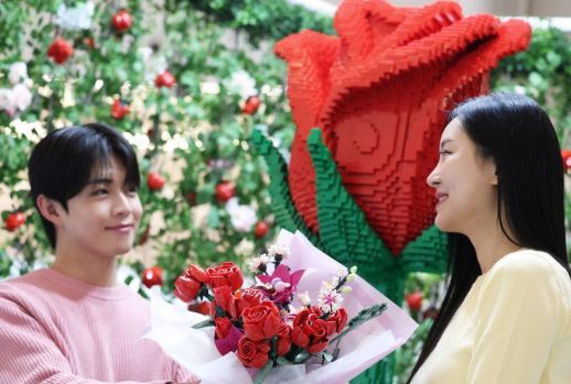 6일 오전 서울 송파구 롯데월드몰에 오픈한 밸런타인데이 맞이 ‘레고 보태니컬’ 팝업스토어에서 모델이 레고로 만든 장미 꽃다발을 들고 포즈를 취하고 있다. 뉴스1