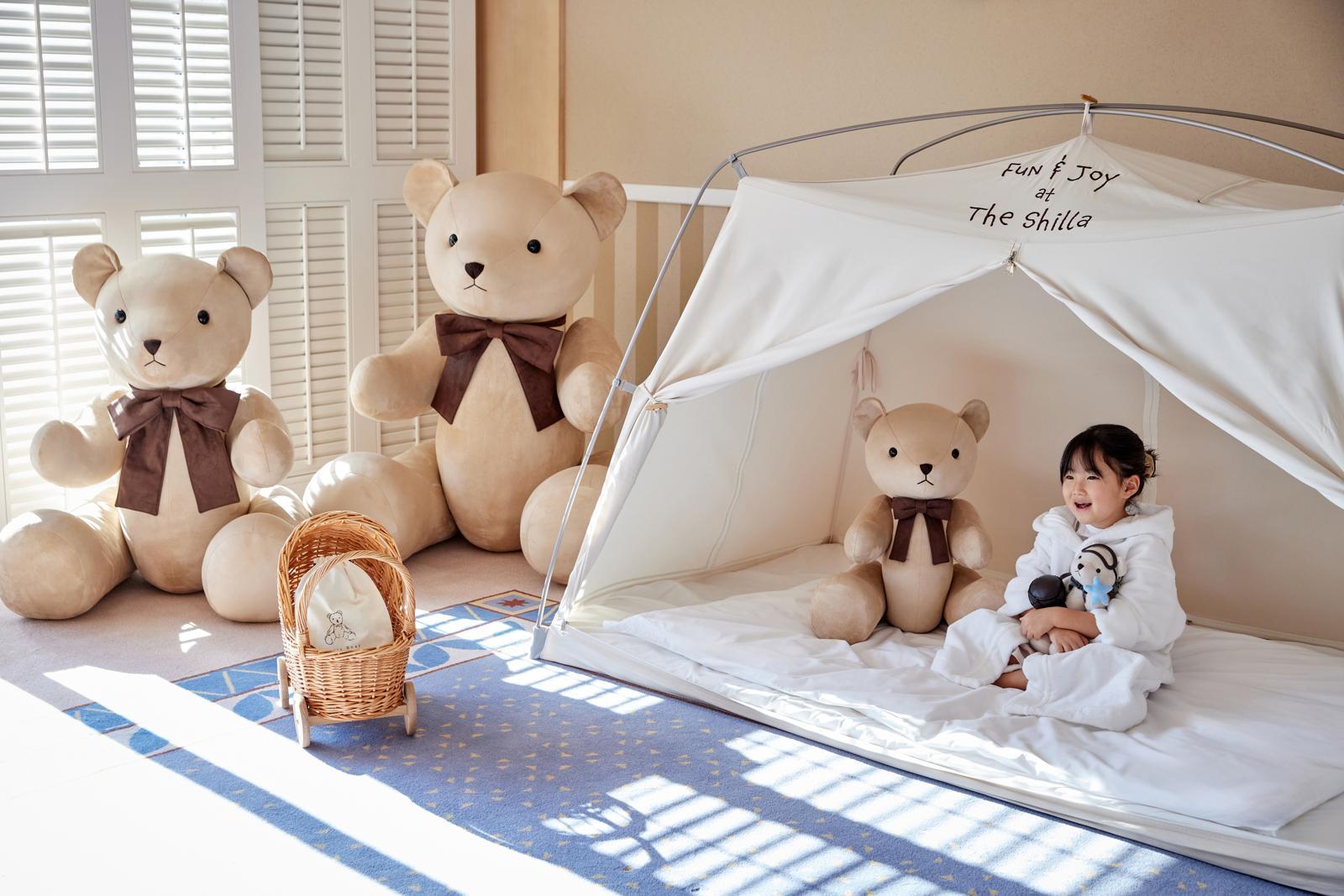 신라베어 테마룸은 호텔 내 단 2개 객실만 운영되는 한정 객실로, 가족 고객 선호도가 높은 정원 전망 스위트 객실에 조성됐다. 객실에는 아이들이 좋아하는 키즈 텐트를 설치하고, 소·중·대형 신라베어 인형과 신라베어 자수 쿠션, 신라베어 자수 키즈 욕실가운 등 신라베어 테마 소품을 비치해 아이 눈높이에 맞춘 공간으로 완성했다.