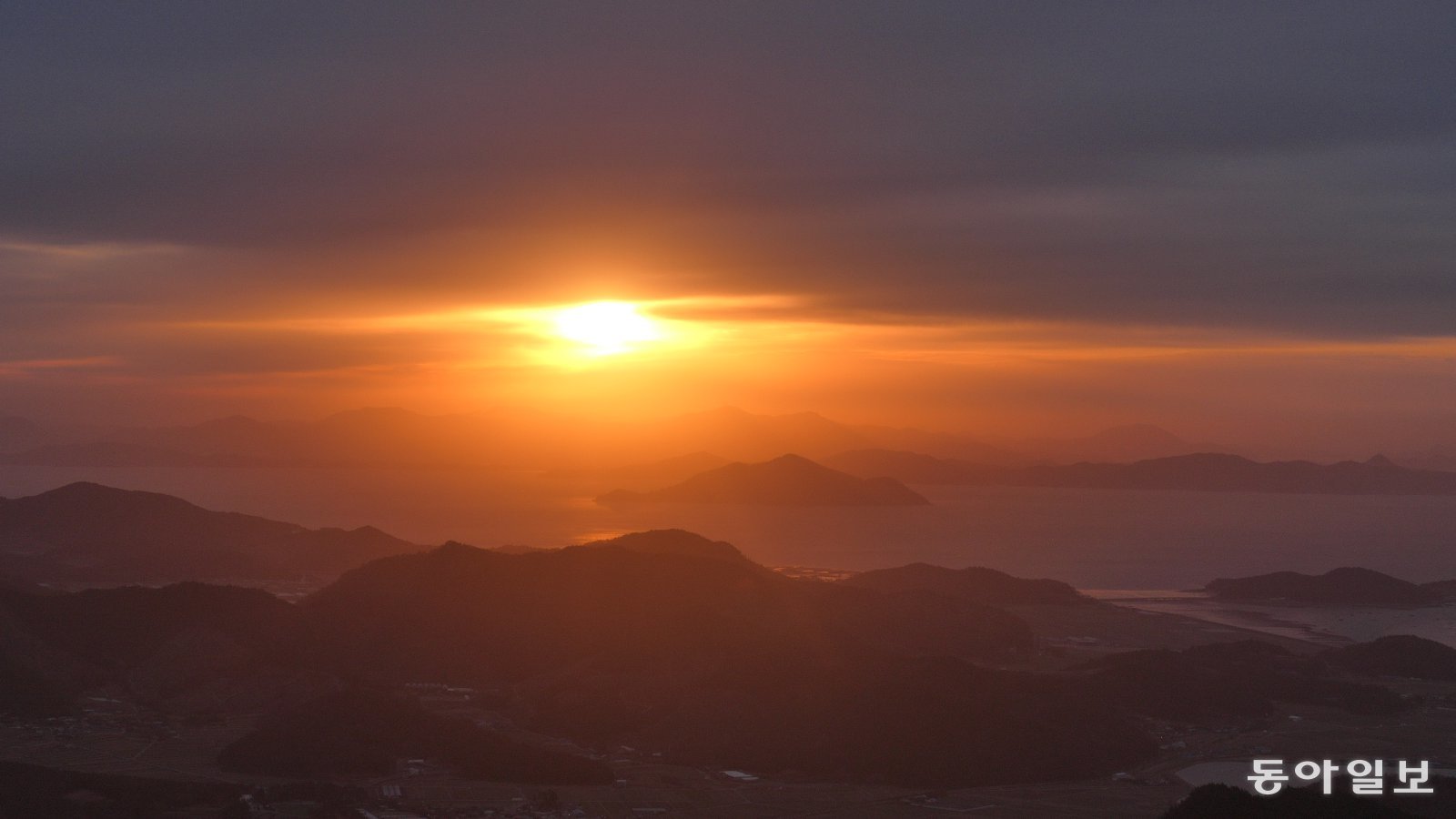 전남 장흥군 억불산 정상에서 바라본 득량만 일출. 구름과 수평선 사이로 태양이 강렬한 빛을 퍼뜨리자 득량도와 섬들, 그 너머 고흥반도 모습이 태초의 순간을 상상케 한다.