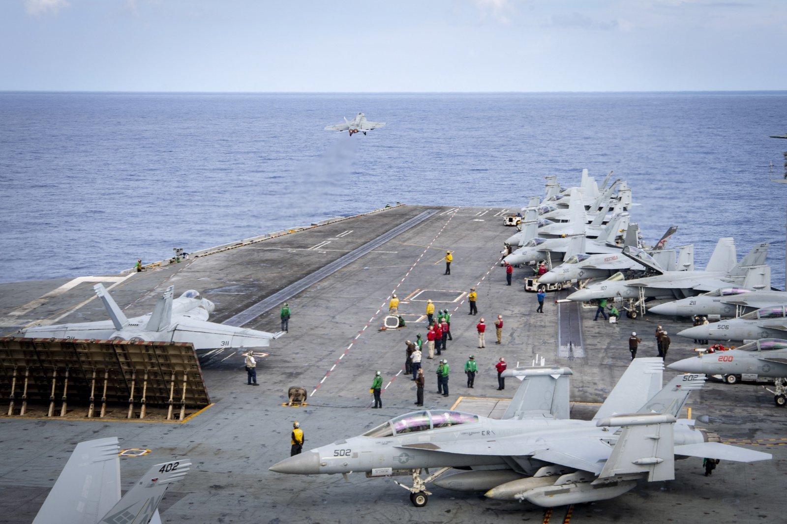 신간 ‘미국은 왜 전쟁을 멈추지 못하는가’는 미국 내 정치인 및 연구 기관이 거대한 군산복합체와 금전적 이해관계로 결탁된 탓에 전쟁이 끊이지 않는다고 본다. 사진은 보잉사 제조 전투기들이 남중국해에서 작전 중인 미국 항공모함에서 이륙하는 모습. 사진 출처 미 해군 ‘X’(옛 트위터)